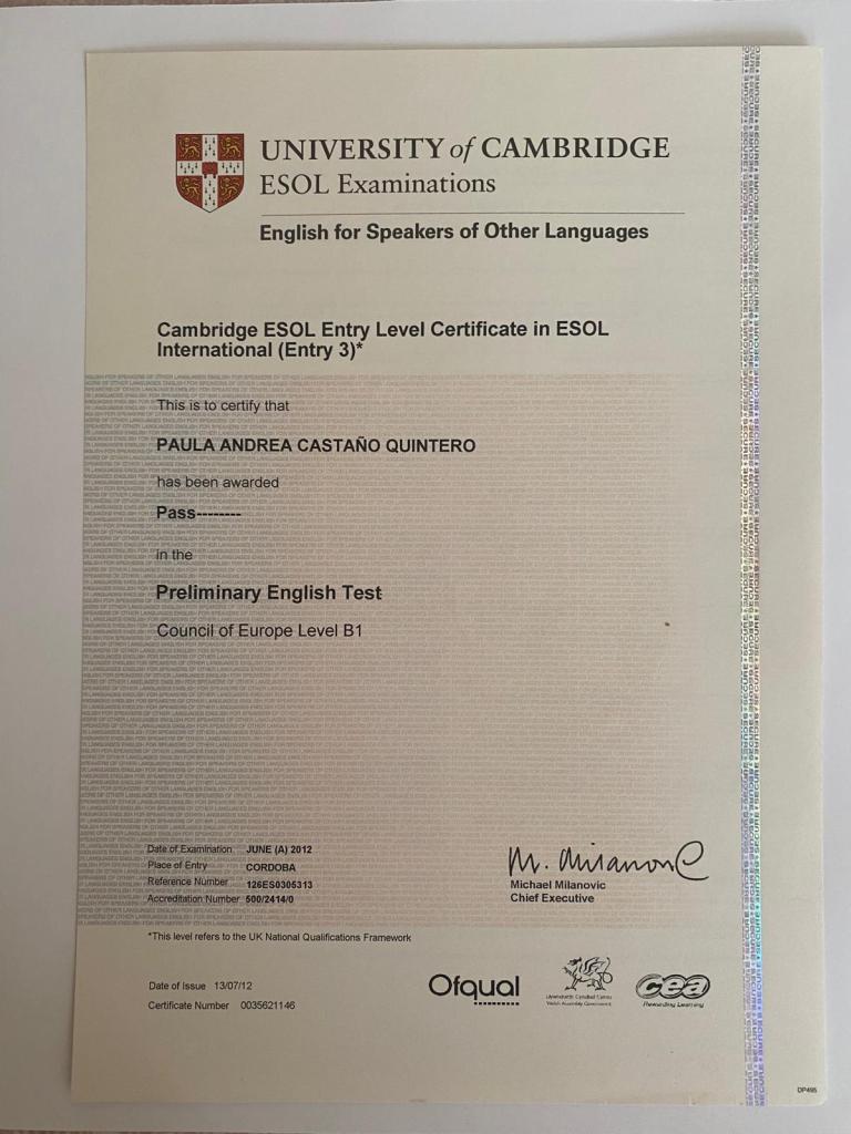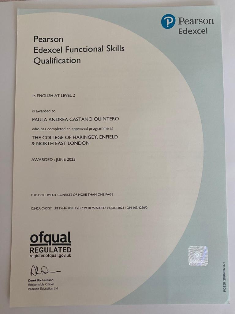 - English Functional Skills Level 2 (Equivalente a B2). The College of Haringey, Enfield and North East London. Julio de 2023.